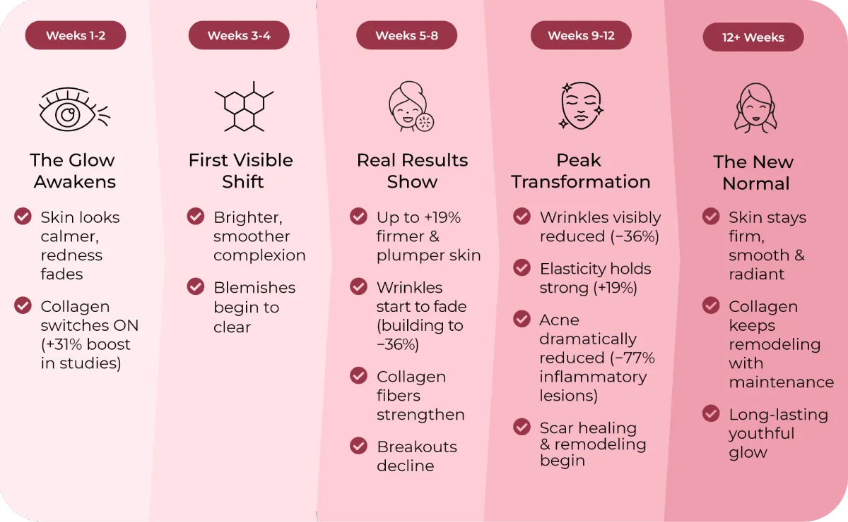 Many women notice smoother, firmer skin and a healthier glow within 14 days. In 30 days, improvements in plumpness and hydration become clear. By 60 days, wrinkles and fine lines are visibly reduced — and with consistent use for 90 days, skin can look up to a decade younger.