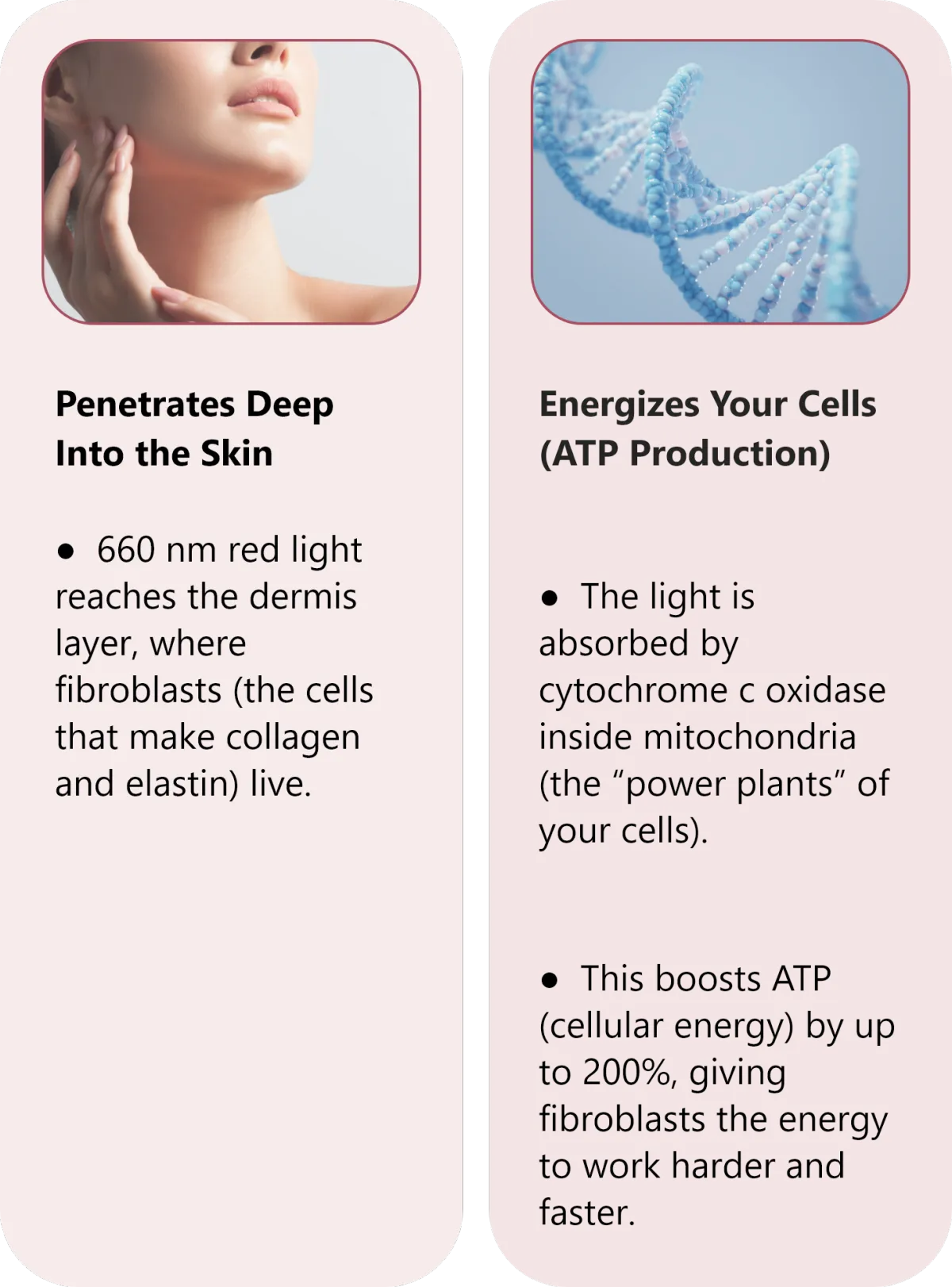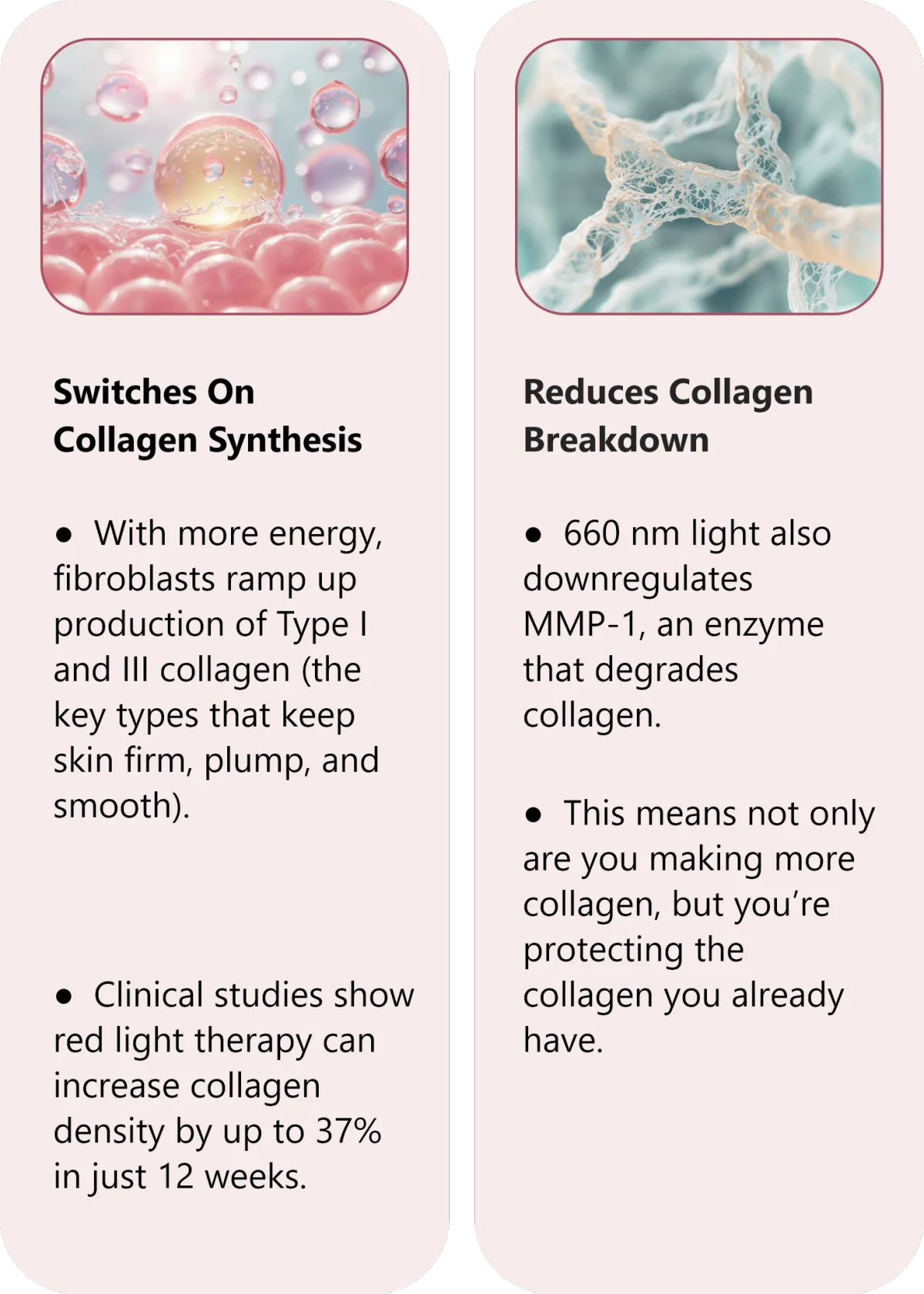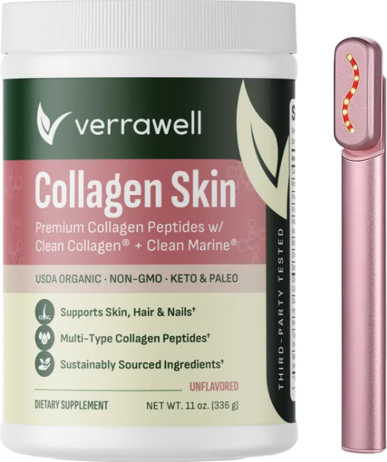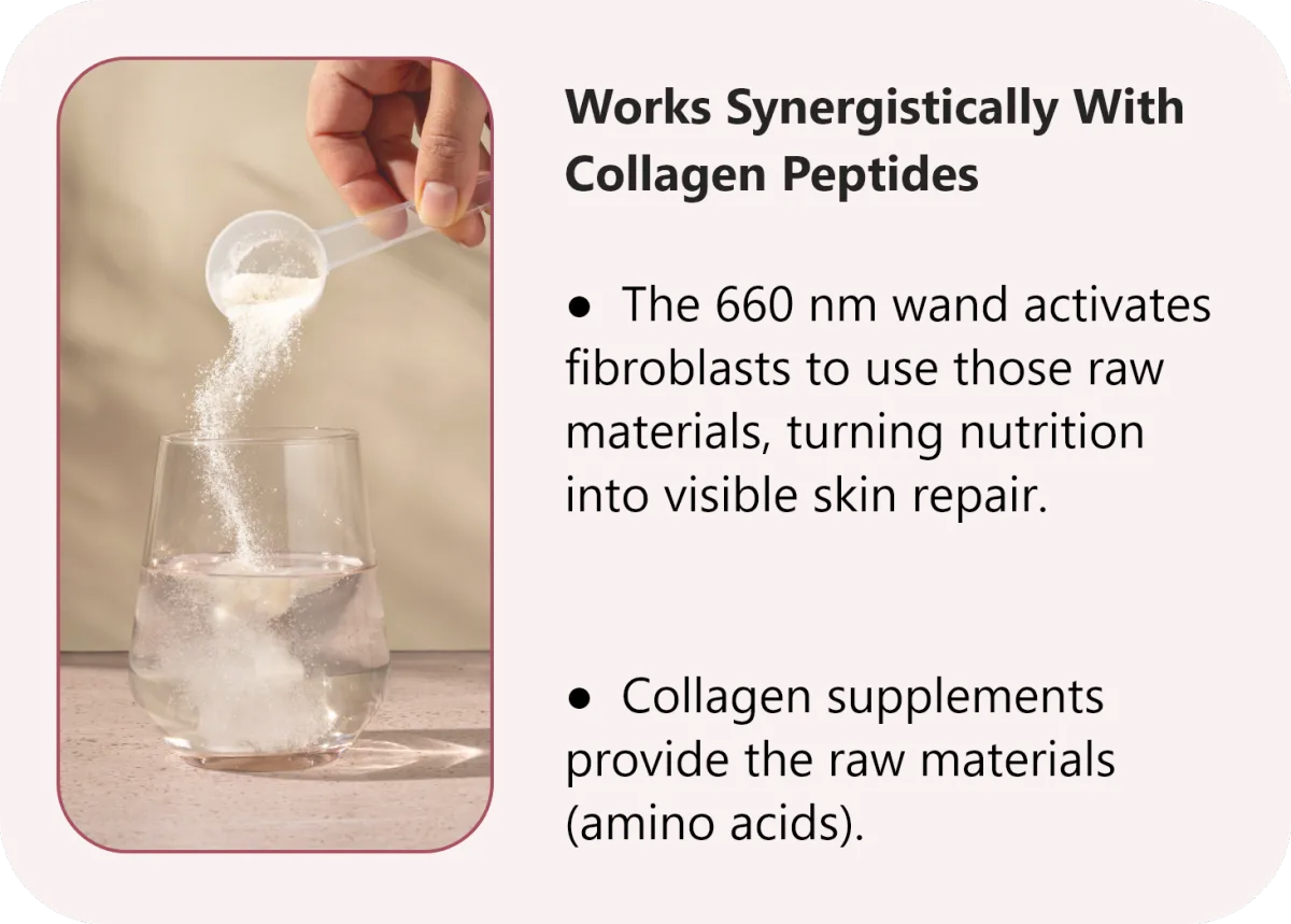 They work best together. Collagen peptides provide the raw materials, while the red light activates fibroblasts to use those peptides effectively. That’s why our system is up to 5X more effective than collagen or red light therapy alone.