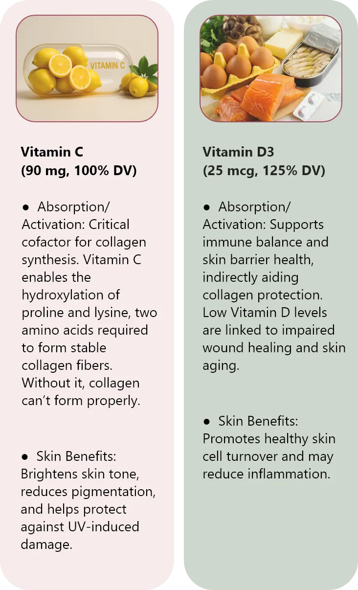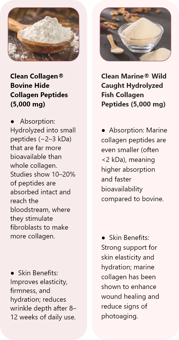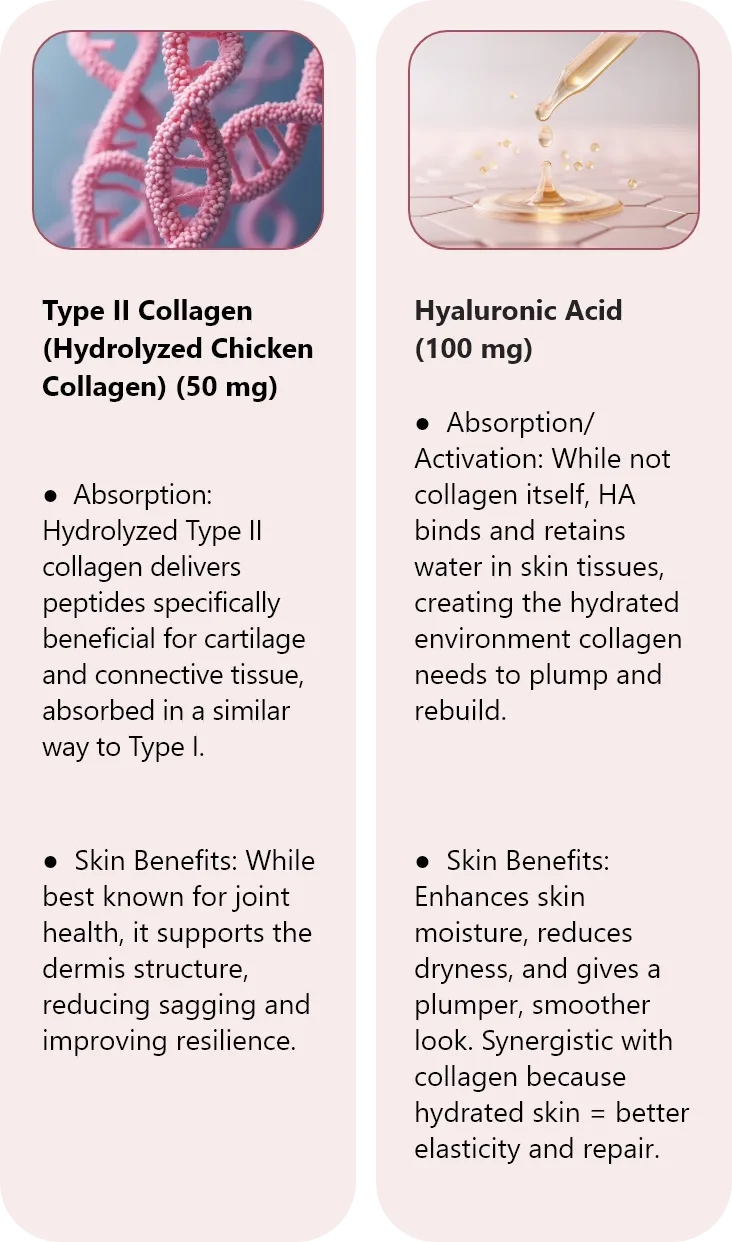 Standard collagen is too large for the body to absorb — most of it just passes through. Our formula uses hydrolyzed multi-source collagen peptides (bovine, marine, and chicken) that are 10–20% absorbed intact, combined with Vitamin C, zinc, hyaluronic acid, and bamboo silica to activate and stabilize collagen in the skin.